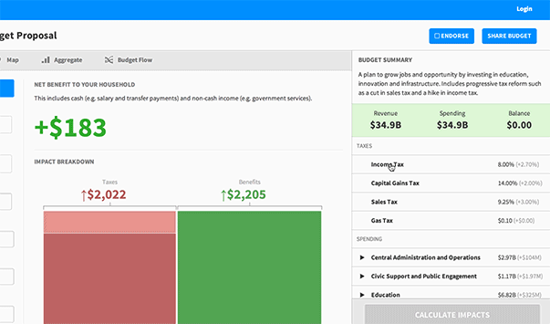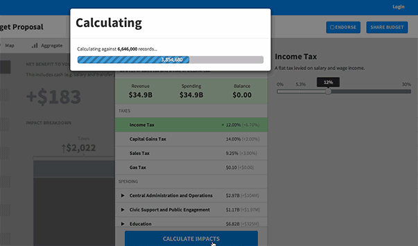 Next, we put up a loading bar, but we had the same problem. Loading happened instantly, so the bar would only be visible for a split second. So, the loading bar was faked. Users had to click "Calculate Impact" to kick off the simulation. Even though everything was done by the time the user actually saw the loading bar, we enforced a few second manual delay. This created a much better experience. Not only that, it taught the user what we were doing. Anytime time a user was forced to wait, it was an opportunity to teach them how the system worked.