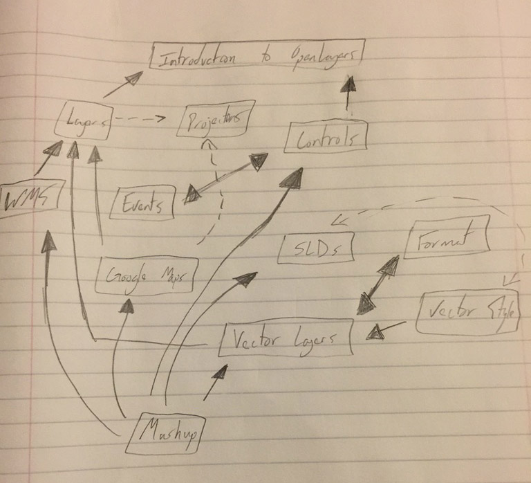 After mapping out the concepts the books would include, as well as how they were related to each other, I then outlined how the OpenLayers concepts would fit in with the programming concepts. This led to creating an outline for the book's overall structure.
