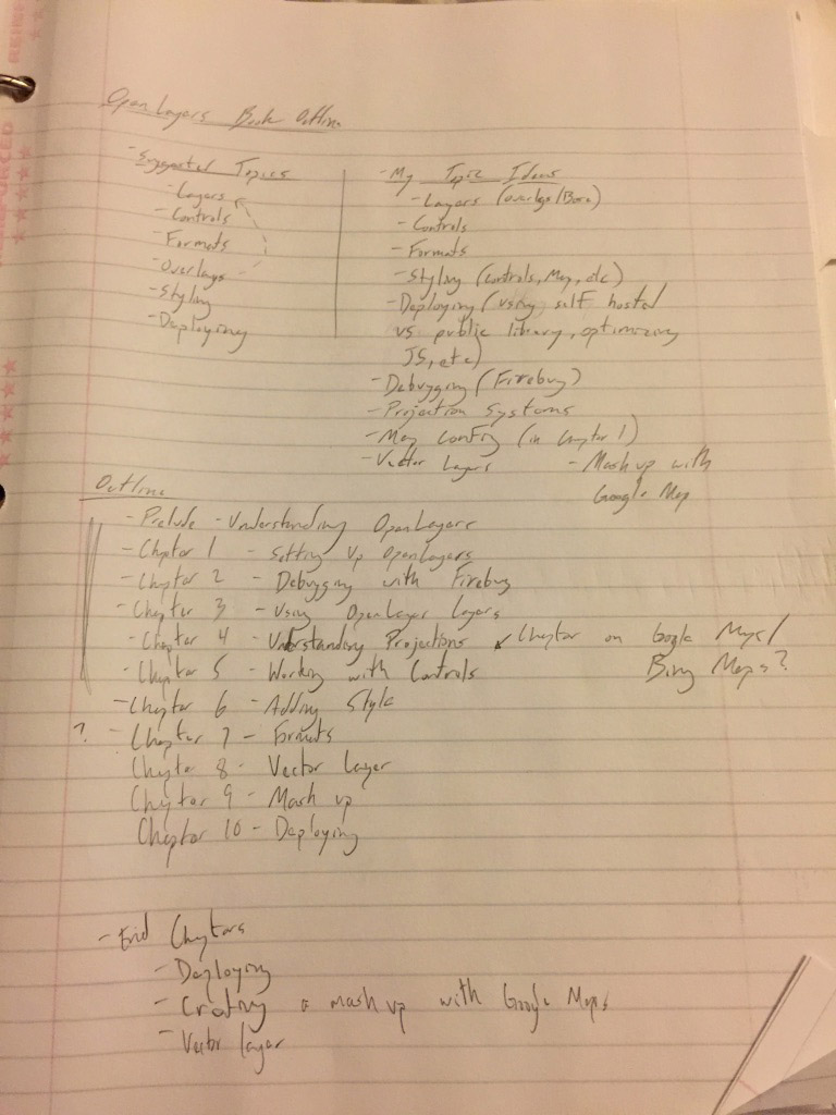 Before I started any writing, I outlined everything. I took a very top-down approach; I specified every concept the book would cover and how they wove into each other. This was an iterative process that took a little over a month. I started by mapping out OpenLayers specific concepts I wanted to communicate.