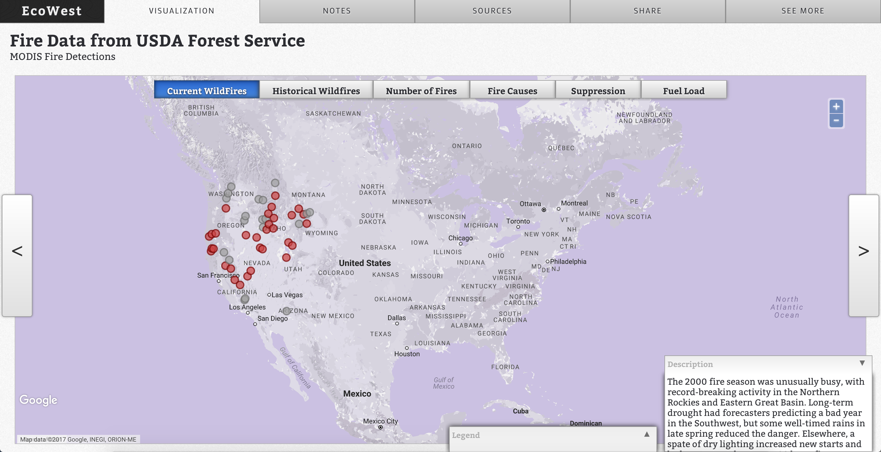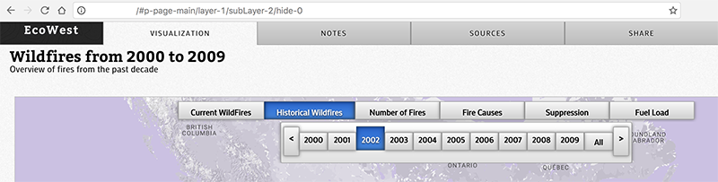 The framework allows users to step between interactive layers - whether they be map components or visualization components. Information boxes are laid on top of the view to provide context and a narrative backbone. Some individual layers also have their inner exploration layers, such as a map layer showing wildfire spread over time, which fits into a larger narrative about wildfires. Switches in interactivity are all exposed through an event system that can be listened to or triggered for even more custom functionality.